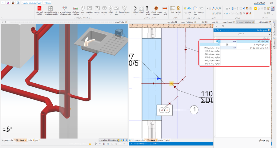 - معین کنید درستی ساختار سیستم تاسیساتی را با بررسی اتصالات تابع (میانبر: Shift + F2). توجه! برای انواعی از وسایل مصرف کننده که جهت اتصال باید نسبت به اجزا دیگر بصورت عمودی باشند (مثلا یک توالت فرنگی با اتصال عمودی (وال هنگ))، این تابع بطور اتوماتیک لوله های کوتاهی را بلافاصله بعد از وسیله مصرفی میسازد تا از صورت گرفتن این اتصال عمودی مطمئن شود.