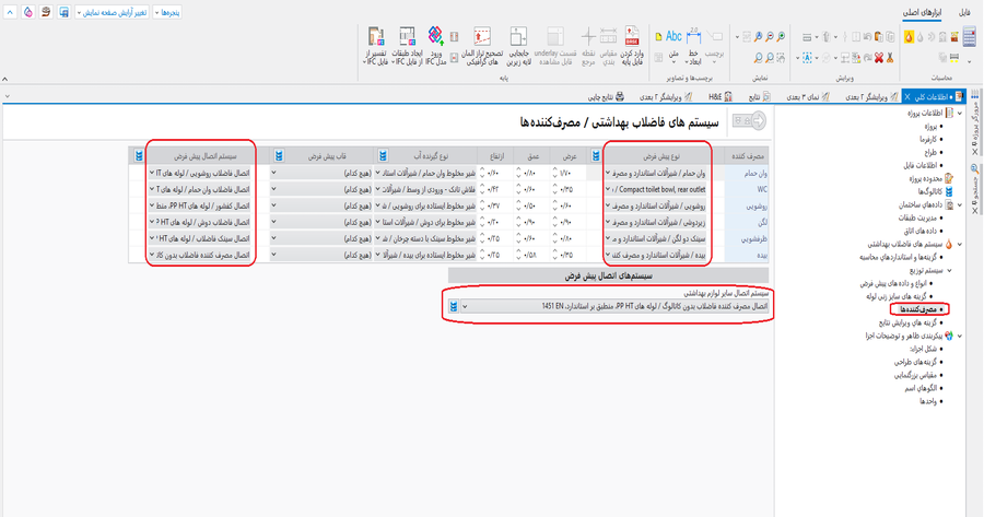 - سیستمهای اتصال پیش فرض از قسمت مربوط به لوله ها جایی که برای اتصالات مشخص شده است، سیستم مناسب را بر اساس نوع مصرف تعیین شده مشخص کنید.