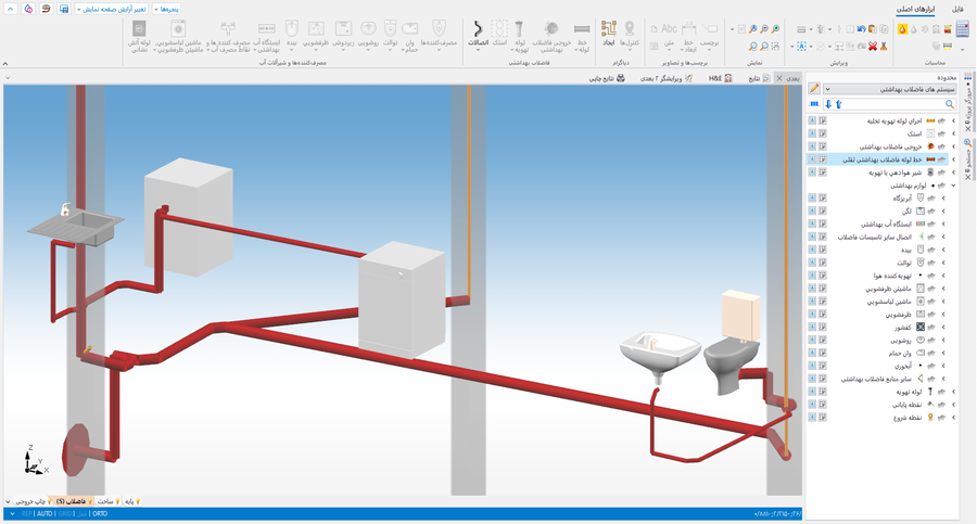- معین کنید درستی ساختار سیستم تاسیساتی را و تشخیص دهید برخوردهای سیستم با سایر سیستم ها را با استفاده از نمای 3 بعدی, اگر ضروری است، نمایش سایر اجزا فعال کنید. ویرایش محدوده ها، توصیه می شود در این حالت دیواره از حالت نمایش خارج شوند.
