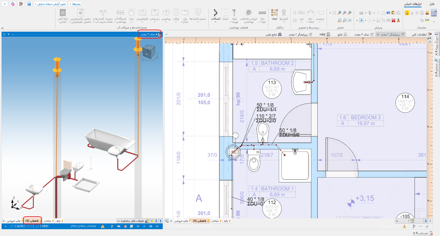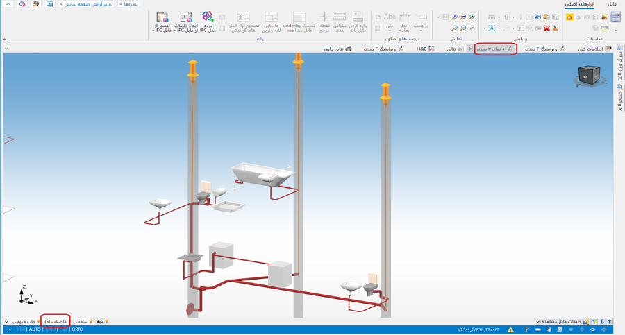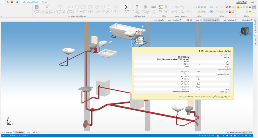 > معین کنید درستی سیستم ساختار تاسیسات فاضلابی را با استفاده از نمای 3 بعدی.]] - بطور موقت، معین کنید درستی مسیرهای لوله های عمودی را در طرح، محاسبات ممکن است بعدا باعث تغییر آن شود.