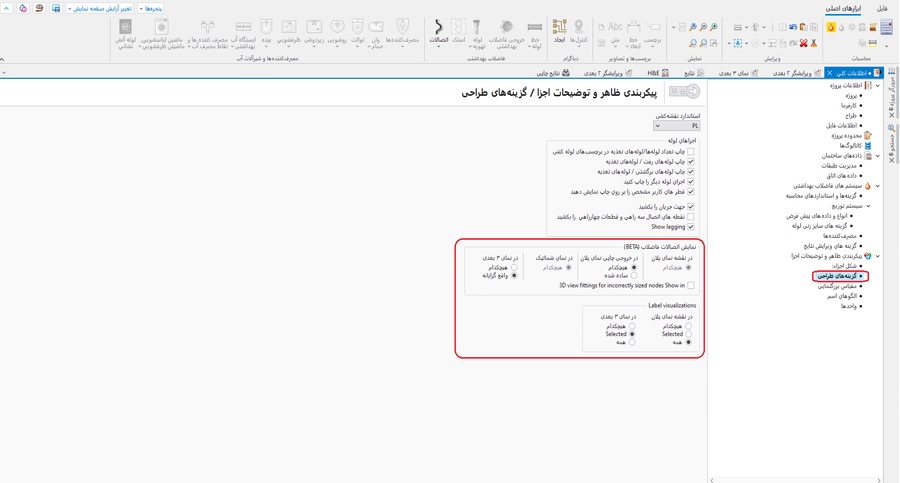 - (اختیاری) اگر کاتالوگی با قابلیت نمایش تصویری اتصالات در نقاط - NODES - در پروژه استفاده شده باشد، می توان از آن برای صحت سنجی درستی اتصالات سایز زده شده برای لوله استفاده کرد. برای انجام چنین کاری، به تصویر کشیدن نقاط (node visualization) باید روشن شود در نمایش اتصالات فاضلاب (BETA) در نقشه نمای پلان و در نمای 3 بعدی درون اطلاعات كلي پنجره در گزینههای طراحی برگه