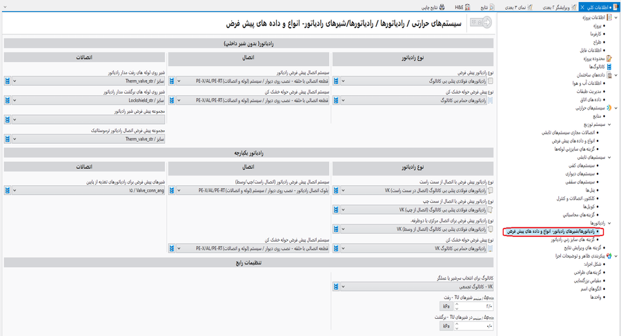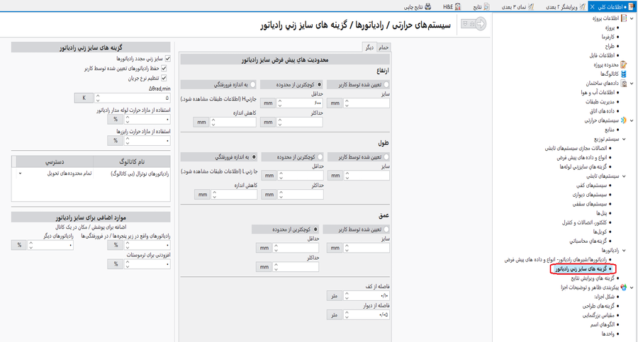 - تب سیستمهای حرارتی/رادياتورها/گزینه های سايز زني رادياتور – بازبینی، تصحیح و افزودن پارامترهای پایه :