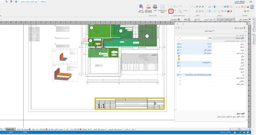 چیدمان اتاقها بر اساس نقشه پایه اتوکد است. اطلاعات بیشتر در جدول مثال پروژه. پروژه شامل مجموعهای کامل از اطلاعات پیشفرض تعریف شده بصورت یک فایل الگو است.