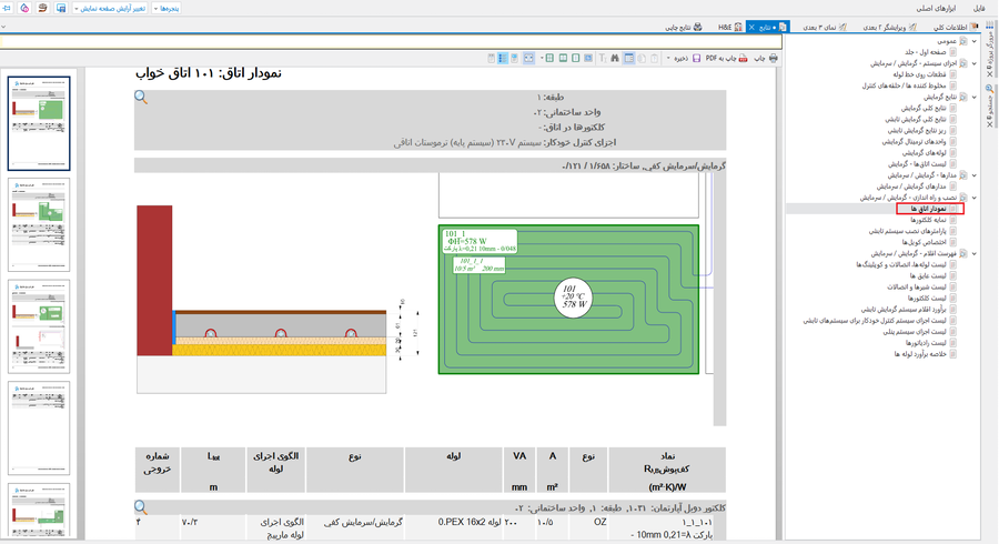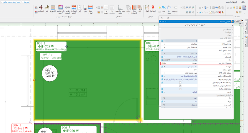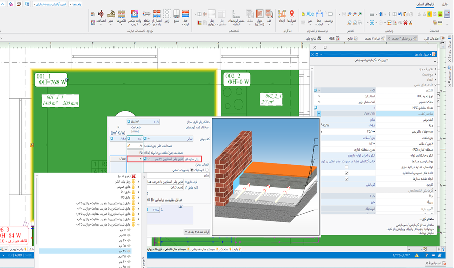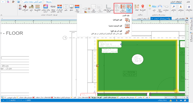 - منطقه گرمایش / سرمایش را در حالت انتخاب قرار دهید و نوع کف پوش را مشخص کنید. پوشش.