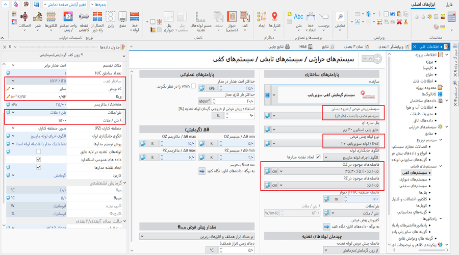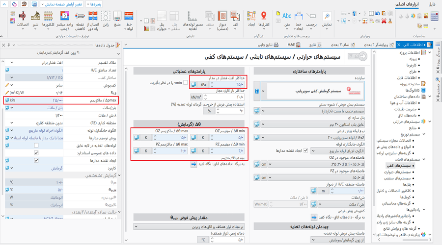 - تغییر در صفحه محاسبات تعاملی سیستمهای تابشی پارامترهای تعیین شده توسط نرم افزار: و/یا اختلاف دمای رفت-برگشت.
