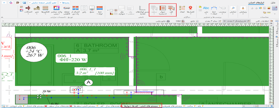 - آیکون منطقه گرمایش / سرمایش در پنجره ویرایشگر دوبعدی در نوار ابزار ابزارهای اصلی , بخش تابشی برای حوزههای ویرایشی سیستم های تابشی - کفها، دیوارها یا سیستم تابشی-سقفها واقع شده است.