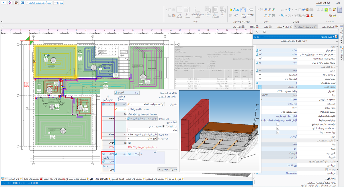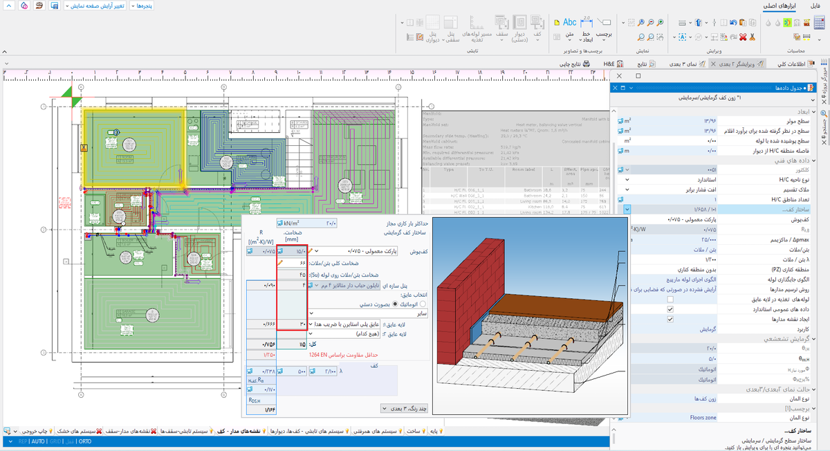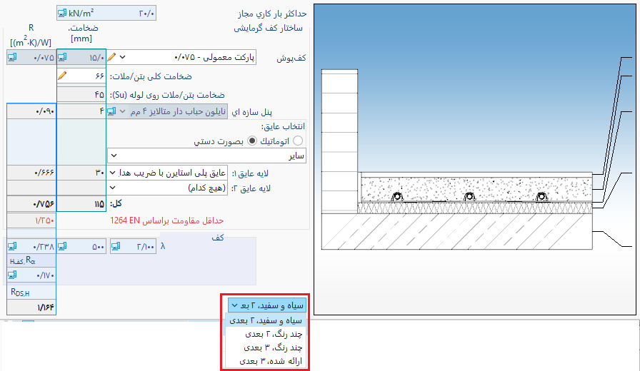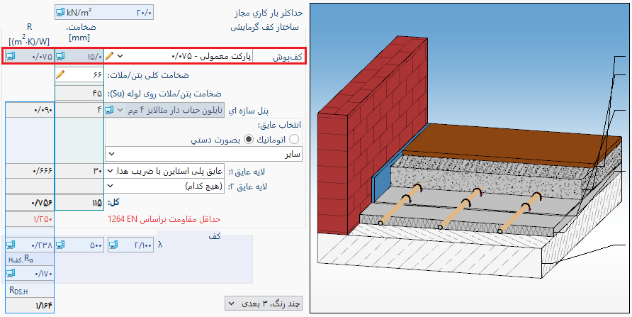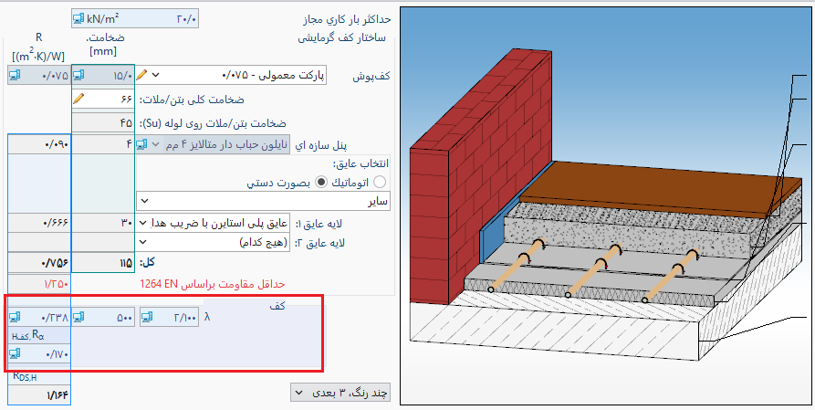- فیلد ساختار کف گرمایشی \ ايجاد ديوار حرارتی \ ساخت سقف گرمایش و سرمایش ، ضخامت کلی منطقه گرمایش / سرمایش و همچنین مقاومت حرارتی کل کف را نشان میدهد .