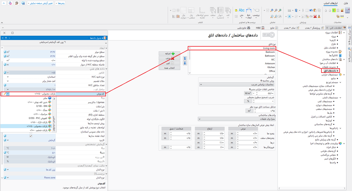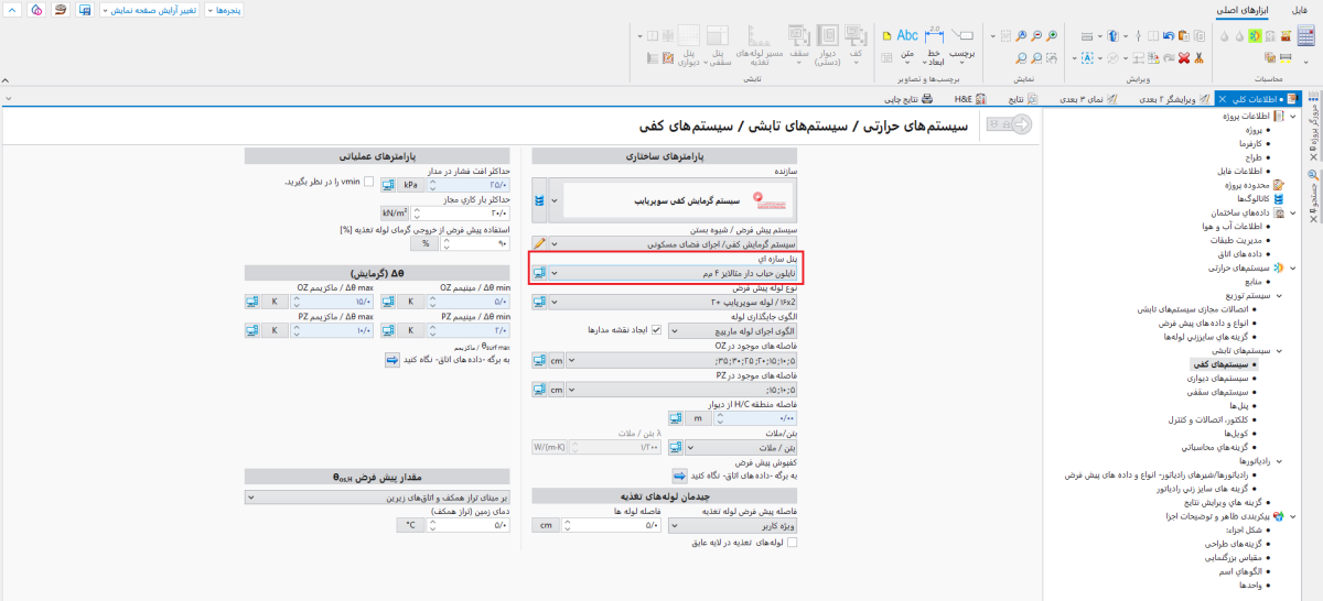 ویرایشگر ساختار کف مناطق گرمایش/سرمایش در این موقعیت واقع شده است: در جدول دادهها پس از تیک زدن منطقه گرمایش / سرمایش و سپس چک کردن در لیست کشویی ساختار کف گرمایشی \ ايجاد ديوار حرارتی \ ساخت سقف گرمایش و سرمایش.