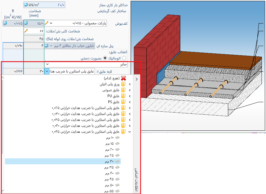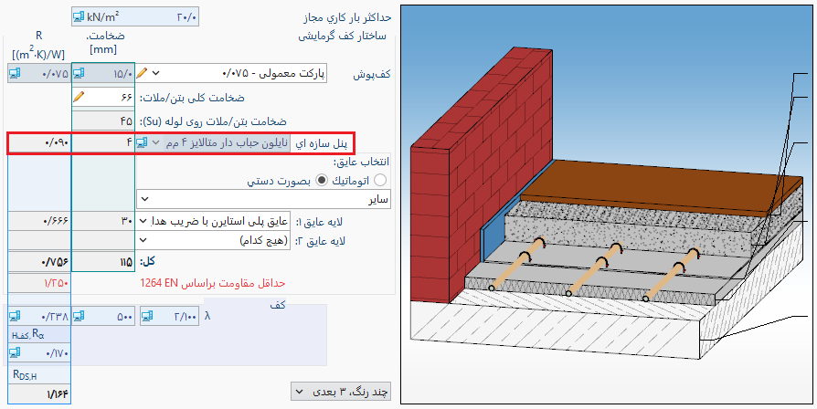 نرم افزار، عملیات انتخاب عایق برای پنل سازهای را با در نظر گرفتن حداقل مقاومت طبق استاندارد EN 1264: 1:2011 2:2013 3,4:2009 5:2008 و نیز با توجه به دماي سمت ديگر (فضای زیرین)، انجام میدهد. - دستی